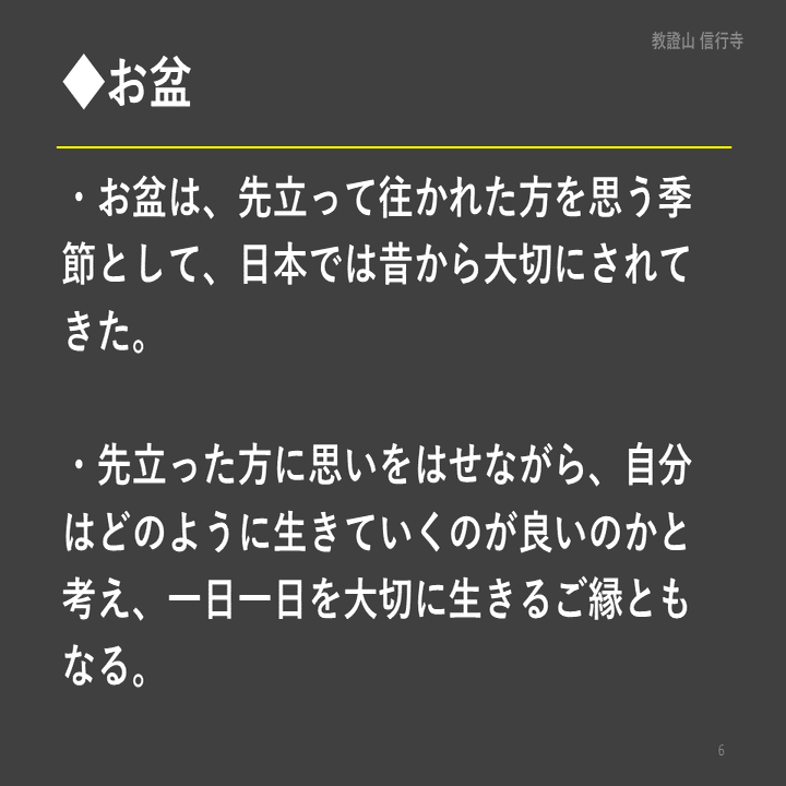 また、先立った方を通して、私たちのいのちの有限性にも思いをはせ、一日一日を大切に生きるご縁ともなることでしょう。