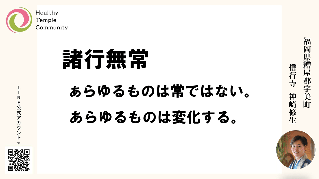 諸行無常という言葉は、聞かれたことはあるかと思いますが、「あらゆるものは常ではない」「あらゆるものは変化する」という意味の言葉です。
