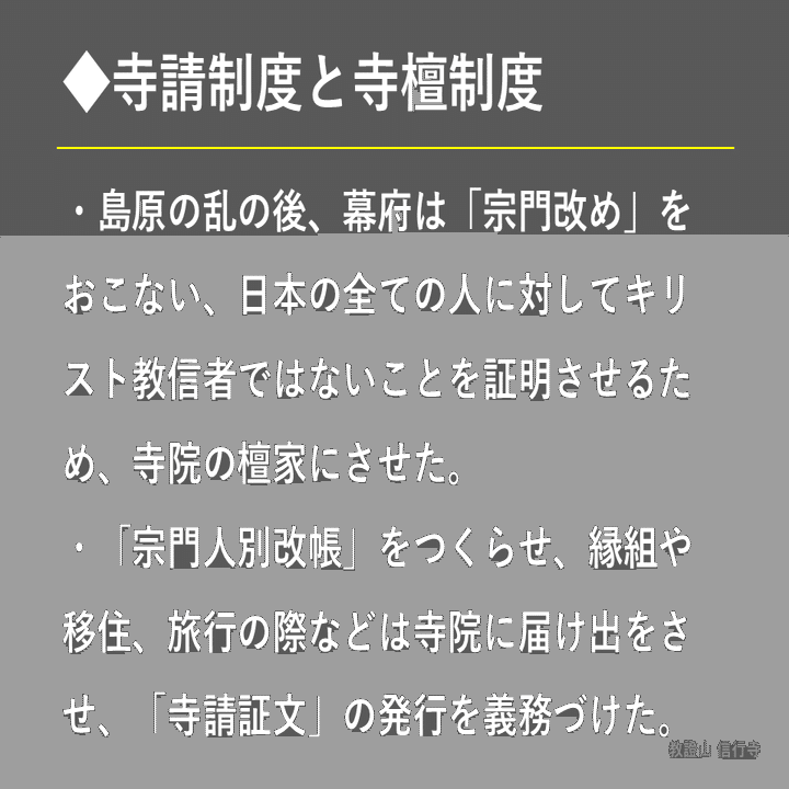 島原の乱の後、幕府は「宗門改め」(しゅうもんあらため)をおこない、日本の全ての人に対してにキリスト教信者ではないことを証明させるため、寺院の檀家にさせました。