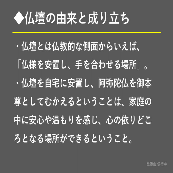 この考え方は、特定の宗派や浄土真宗の考え方というわけではありませんが、このようにとらえると、「仏壇とは何か」が明確になり、腑に落ちるものがあるのではないでしょうか。