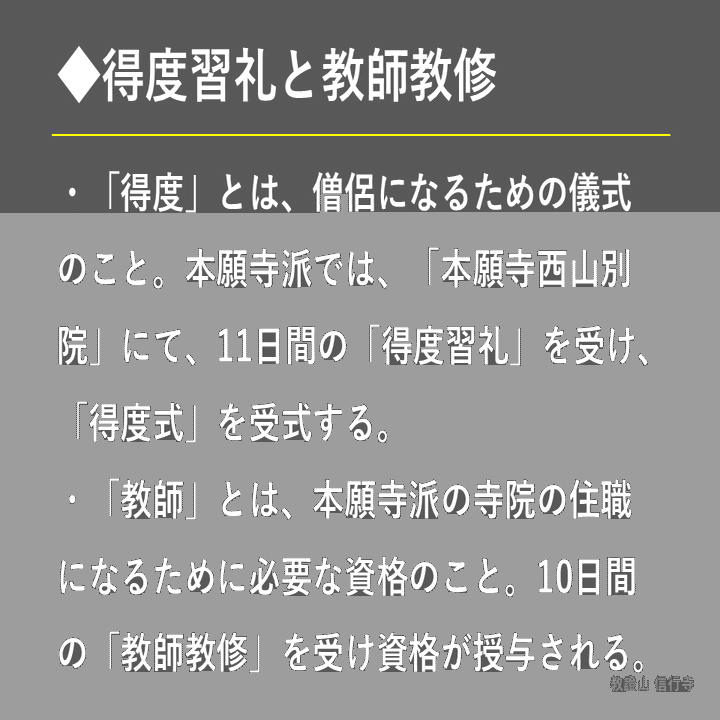 また、「得度習礼」とは別に、「教師教修」というものもあります。